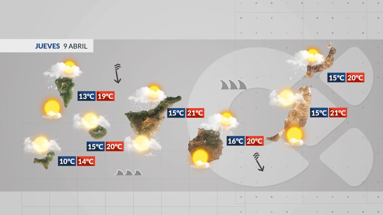 A low-pressure area near the eastern islands will influence the weather across the Canary Islands on Thursday, 9 April. The main features are strengthening winds, a rough Atlantic, and the chance of rain, particularly on northern and western slopes. Southern coasts will see calmer conditions.