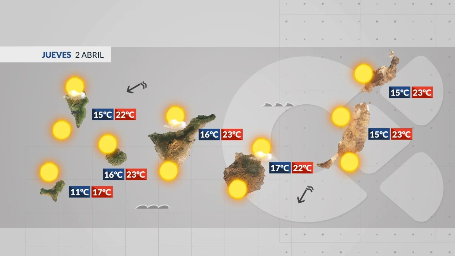 The persistent Saharan dust haze is finally clearing today, Thursday 2 April. It leaves behind a stable day with plenty of sunshine and pleasant temperatures across the archipelago. A moderate northeast wind will be felt, especially on exposed coasts.
