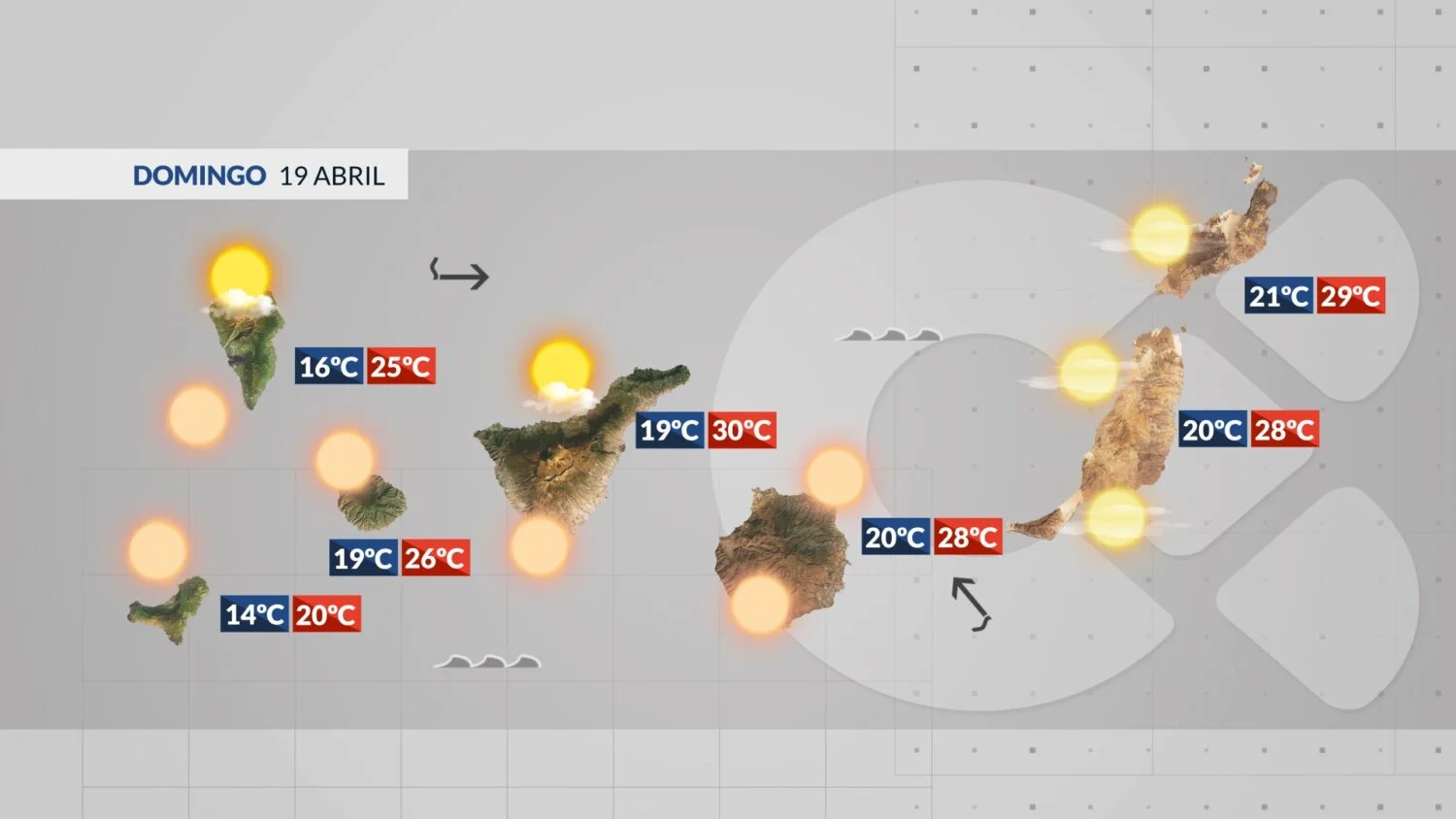 The day will see intervals of medium and high cloud, tending to mostly clear skies. The calima will be significant across mid-altitude and summit areas, and will also affect coastal regions on the eastern islands. Morning temperatures will be cool, but daytime highs are warm and typical for the season, potentially reaching 34°C in some southern and western interior zones. A light to moderate easterly wind will blow on coasts, shifting to a westerly direction later. In mid-altitude and summit areas, expect a moderate to strong southerly wind with very strong gusts likely, exceeding 90 km/h on the peaks of Tenerife and La Palma. The Atlantic will be calm, with waves not exceeding 1.5 metres.
